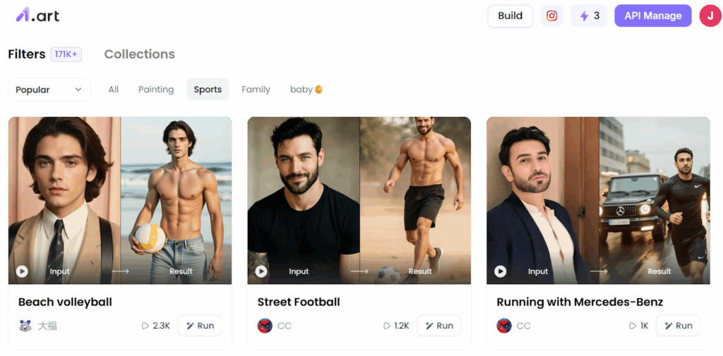 a1.art is more than just a bikini tool. It has a full suite of AI features, such as ai saree, abs editor, etc. The platform provides a massive library of art templates and filters covering categories like sports, family, baby, and more. This gives users endless creative possibilities.